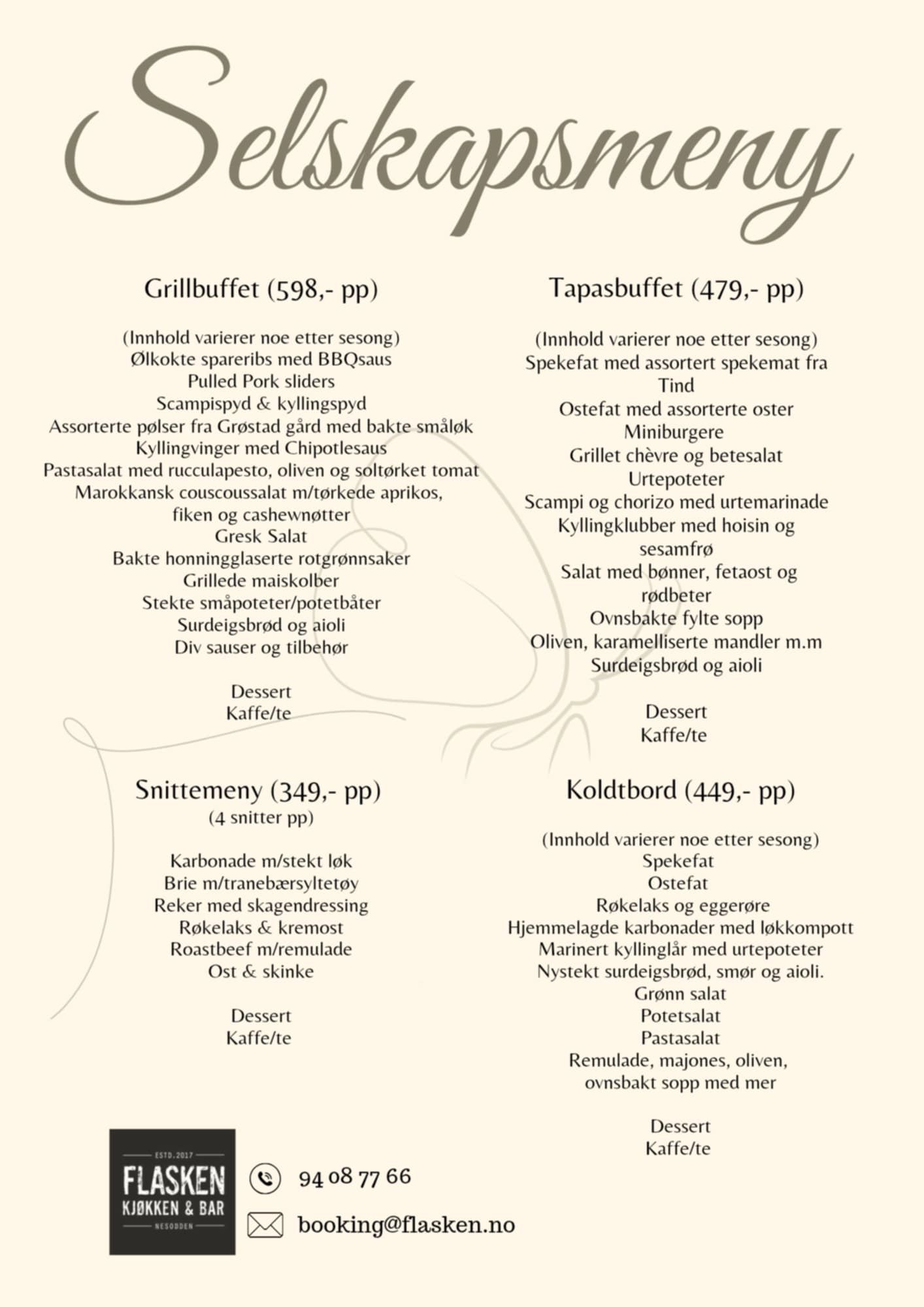 Vi setter sammen meny og tilbud tilpasset ditt selskap. Kanskje du ønsker underholdning? Vårt chambre har scene, prosjektor og det meste av musikkutstyr. Ypperlig for selskap for inntil 40-45 gjester. For større selskap kan lokalet åpnes og kan romme i underkant av 100 sittende gjester.